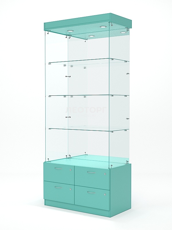 Стеклянная витрина служит для демонстрации товаров в магазине. Модель не имеет дверей. Имеется три стеклянные полки. В верхней части оснащена подсветкой. В нижней части имеется четыре выдвижные полки-накопителя. Материал - ЛДСП и стекло.