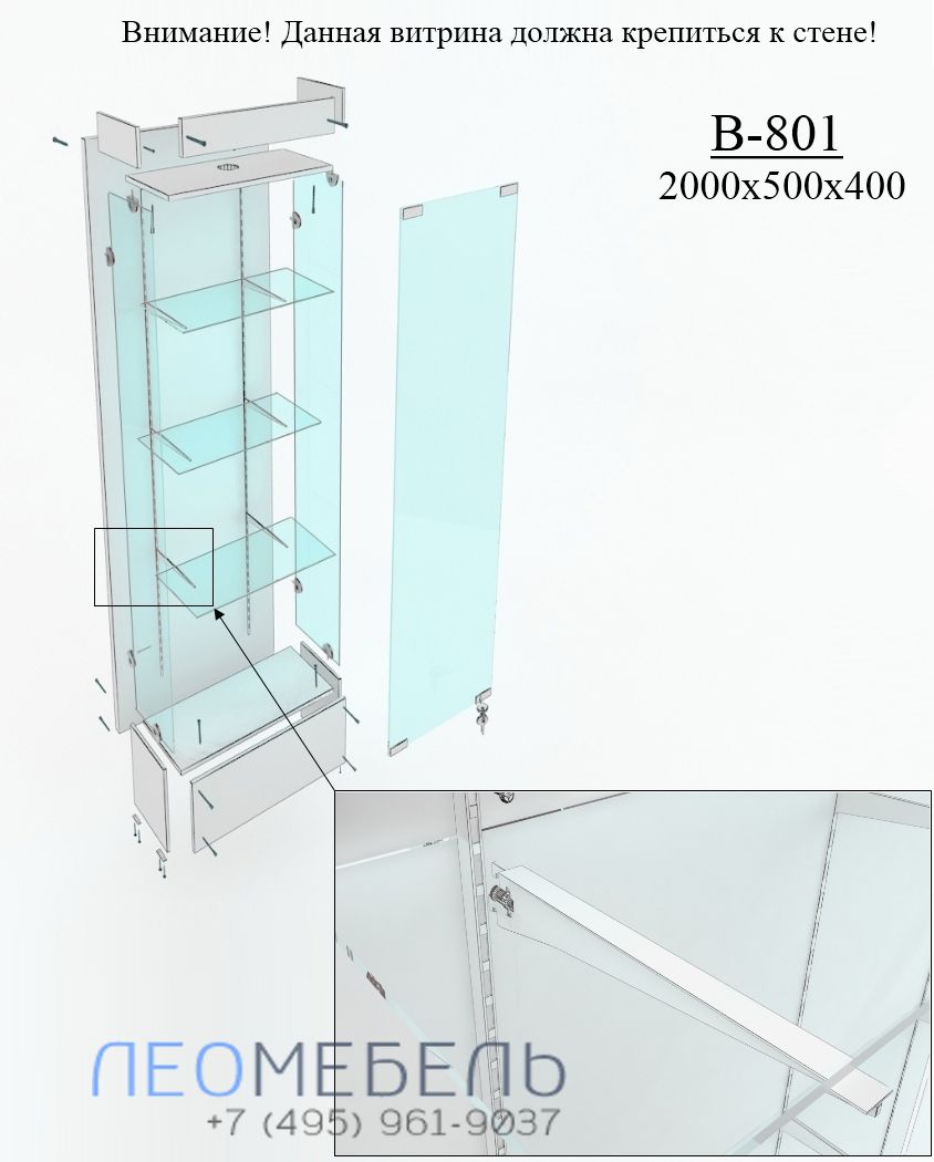 Витрина из ЛДСП (16 мм) с подиумом, 1 стеклянной дверью (5 мм) с замком, 1 светильником (GU5.3 MR16) для подсветки и 3 стеклянными полками (5 мм). Задняя стенка из ЛДСП (16 мм), к которой крепятся 2 перфорированных профиля. Витрина из серии В-800. Лампа в комплект не входит.