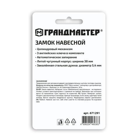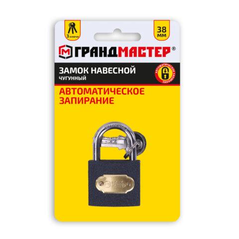 Замок навесной чугунный "Стандарт", ширина 38 мм, английский, 3 ключа, ГРАНДМАСТЕР, 671291
