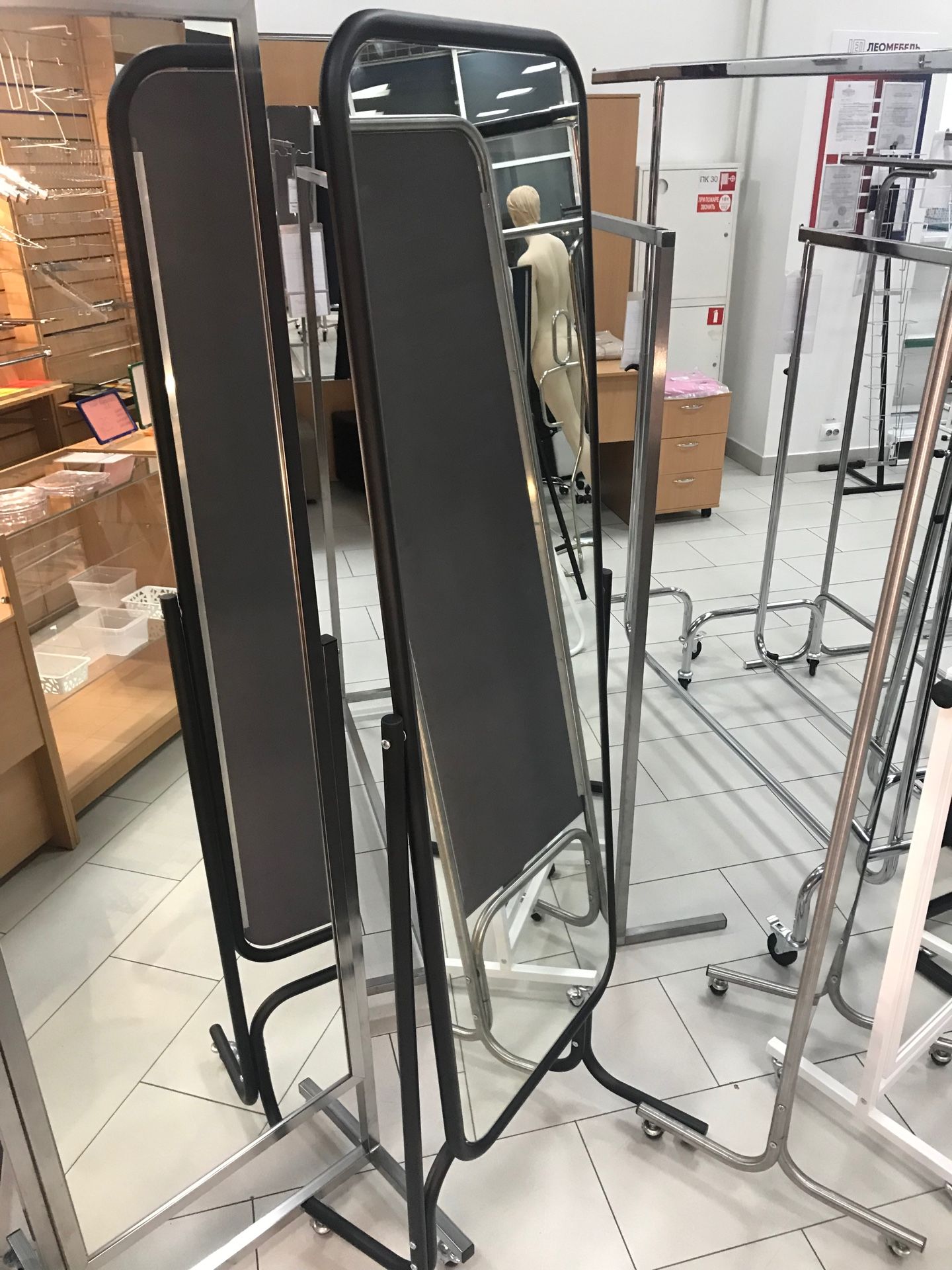 Зеркало примерочное напольное на колесах с изменением угла наклона является незаменимым атрибутом магазина одежды. Размеры зеркального полотна позволяет клиенту в полный рост просмотреть примеряемый товар, а изменение угла обзора дают возможность визуального осмотра со всех сторон.