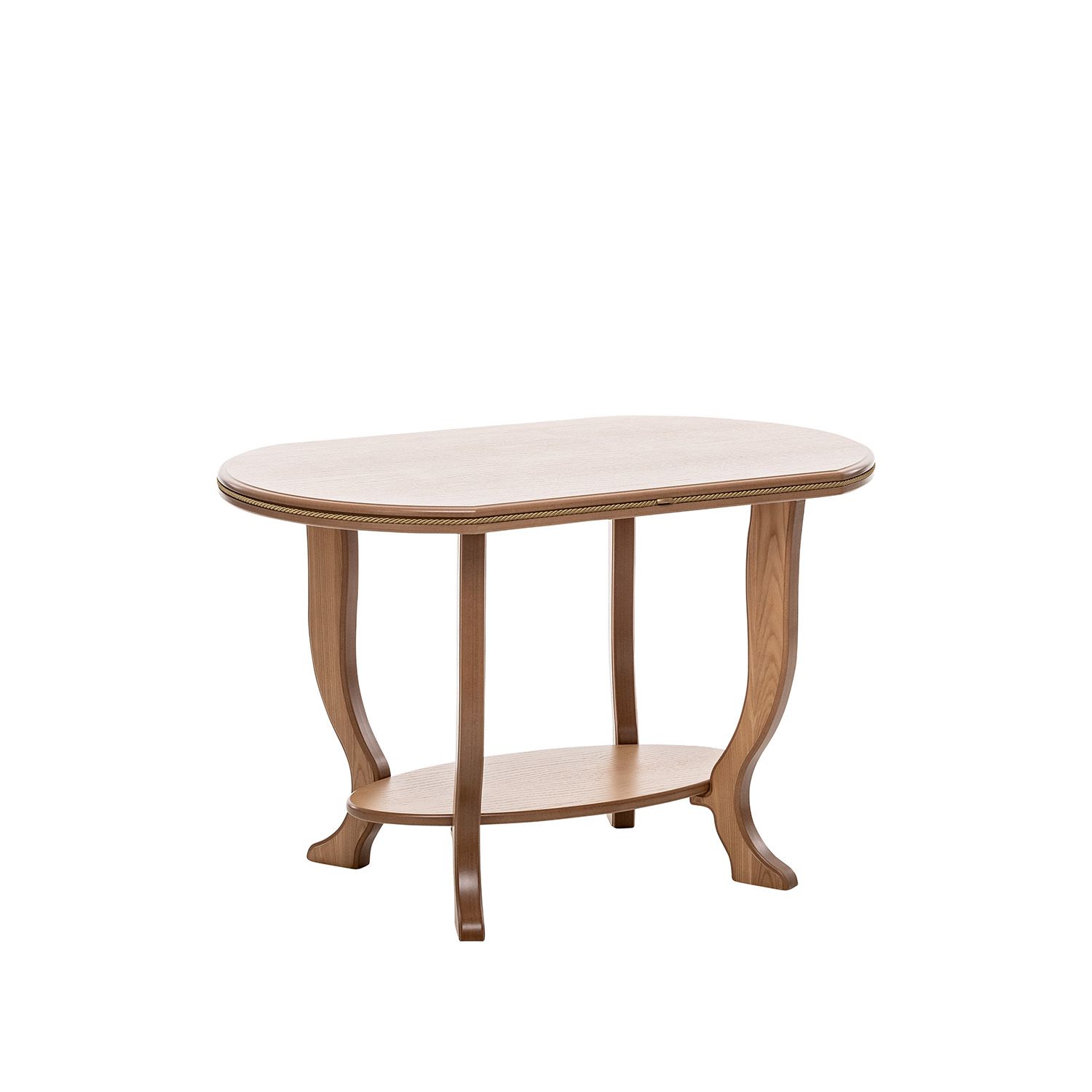 Овальный журнальный столик на изящных ножках-лапах. Выполняется в различных вариантах: с деревянной столешницей или со вставками из прочного стекла, отделывается шпоном различной текстуры. Благодаря полочке под столешницей, стол практичен и очень удобен.