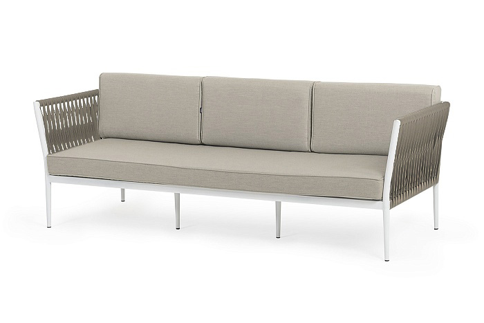"Касабланка" диван 3-местный плетеный из роупа, каркас алюминий светло-серый (RAL7035) муар, роуп серо-коричневый 23мм, ткань бежевая 15052цвет серо-коричневый