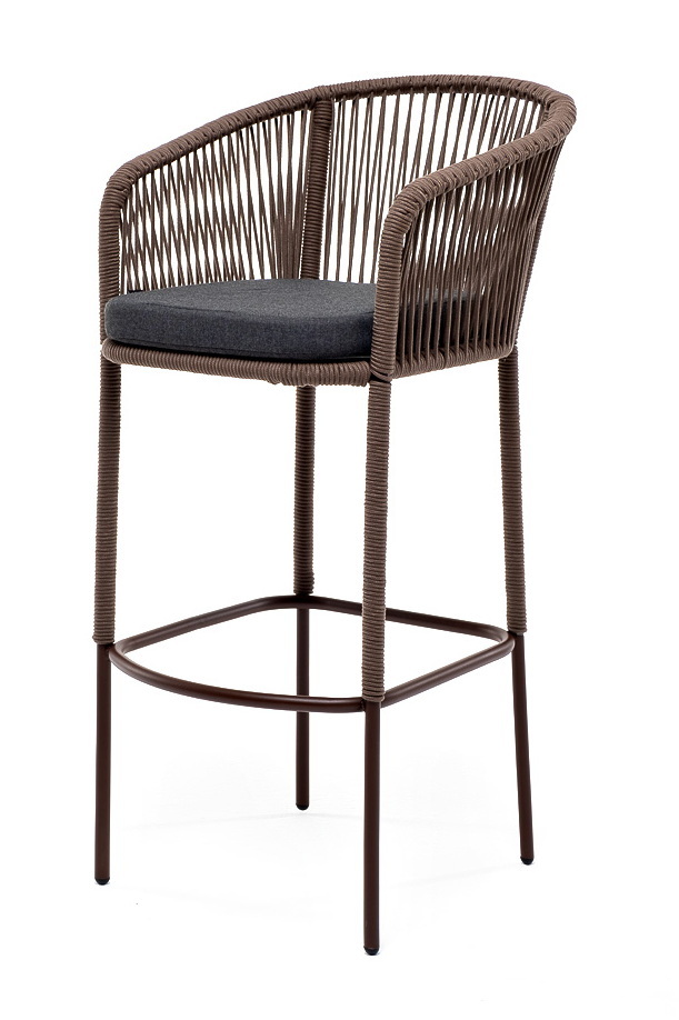 "Марсель" стул барный плетеный из роупа, каркас из стали коричневый (RAL8016) муар, роуп коричневый круглый, ткань темно-сераяцвет коричневый